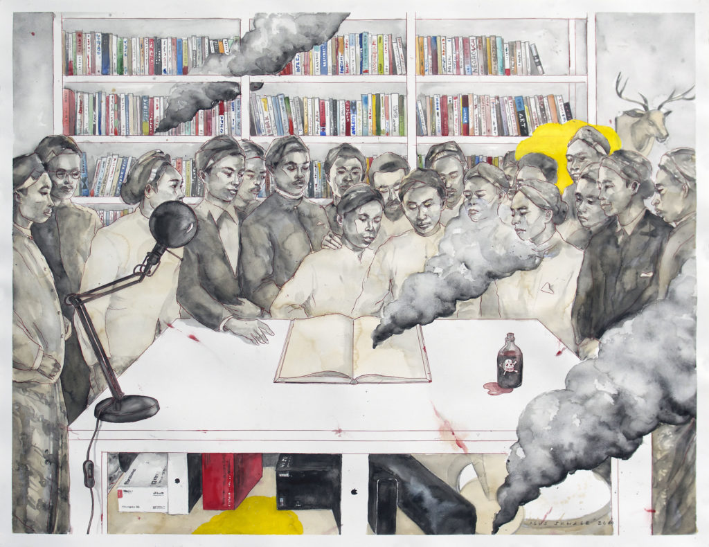 Previous Image Next Image Agus Suwage. Fragmen Pustaka – Bedah Buku. 2019. Watercolour, ink and tobacco juice on paper. 100 x 131 cm lr
